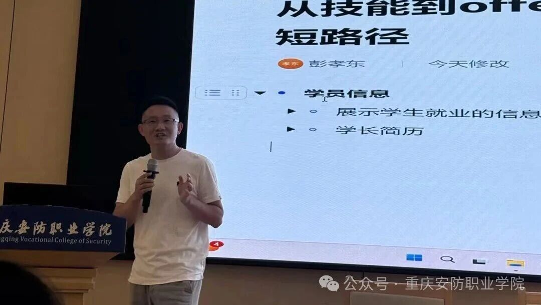 随后,人工智能学院教研办彭孝东主任以《从技能到offer:为你搭建一条从校园到名企的最短路径》为题作专题发言。他立足学院人才培养方案与学科建设实际,指导学生夯实专业基础、提升核心竞争力,并系统介绍了学院通过产教融合助力学生实现从校园到知名企业高效衔接的具体举措。