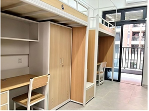 学生公寓现代风又不失温馨舒适,采 用“连体式”组合家具,上床下桌,标准 六人间,24小时不间断热水,卫生间干湿 分区规范有序,均配备空调、洗衣机、直 饮水机等,5GWIFT信号全覆盖,为学生 提供舒适、安全和偷快的住宿体验