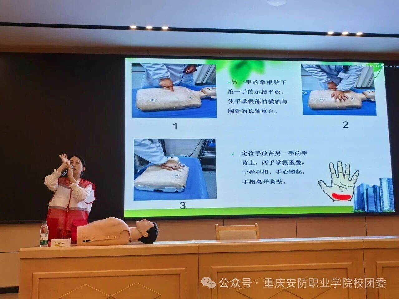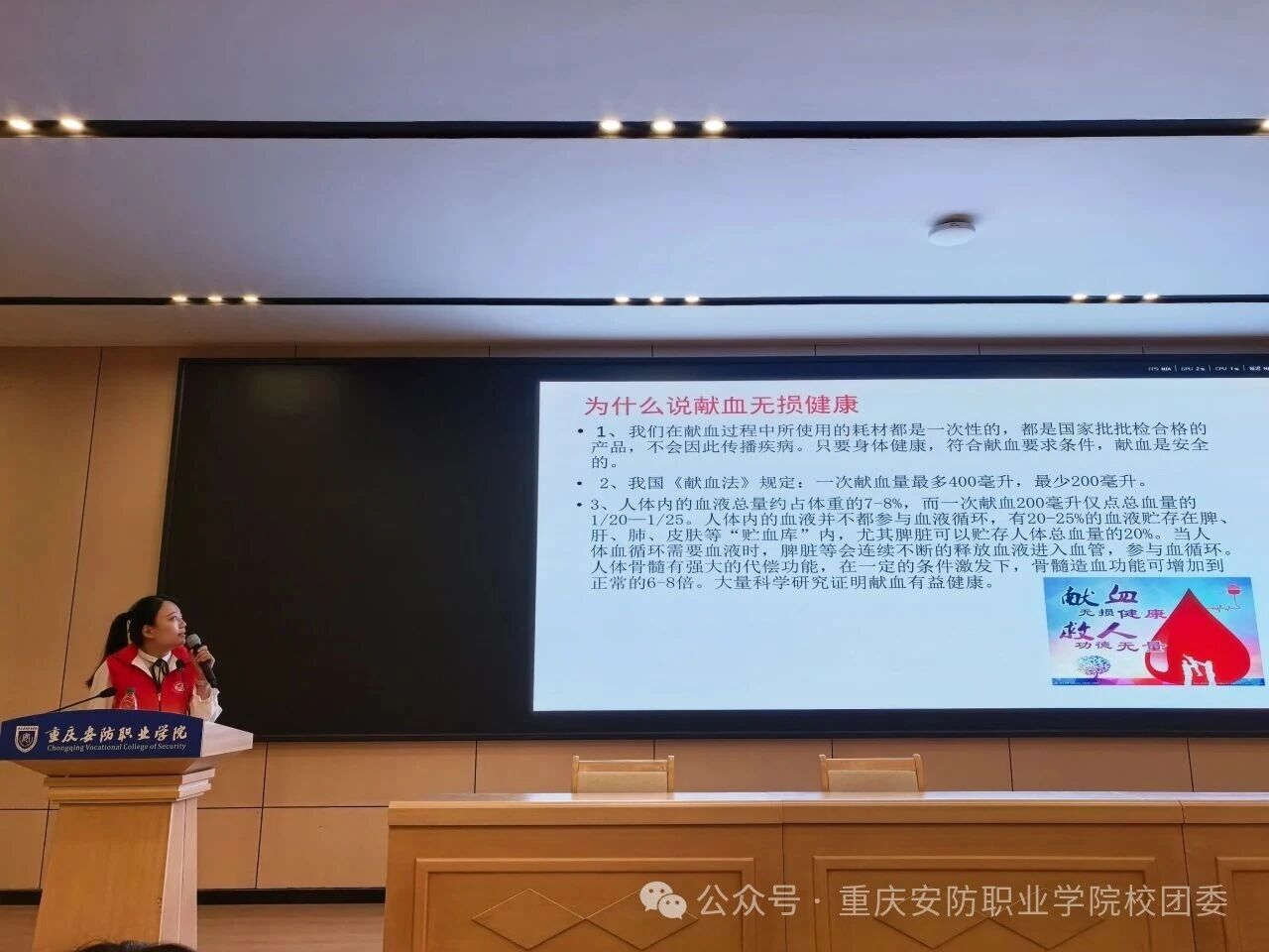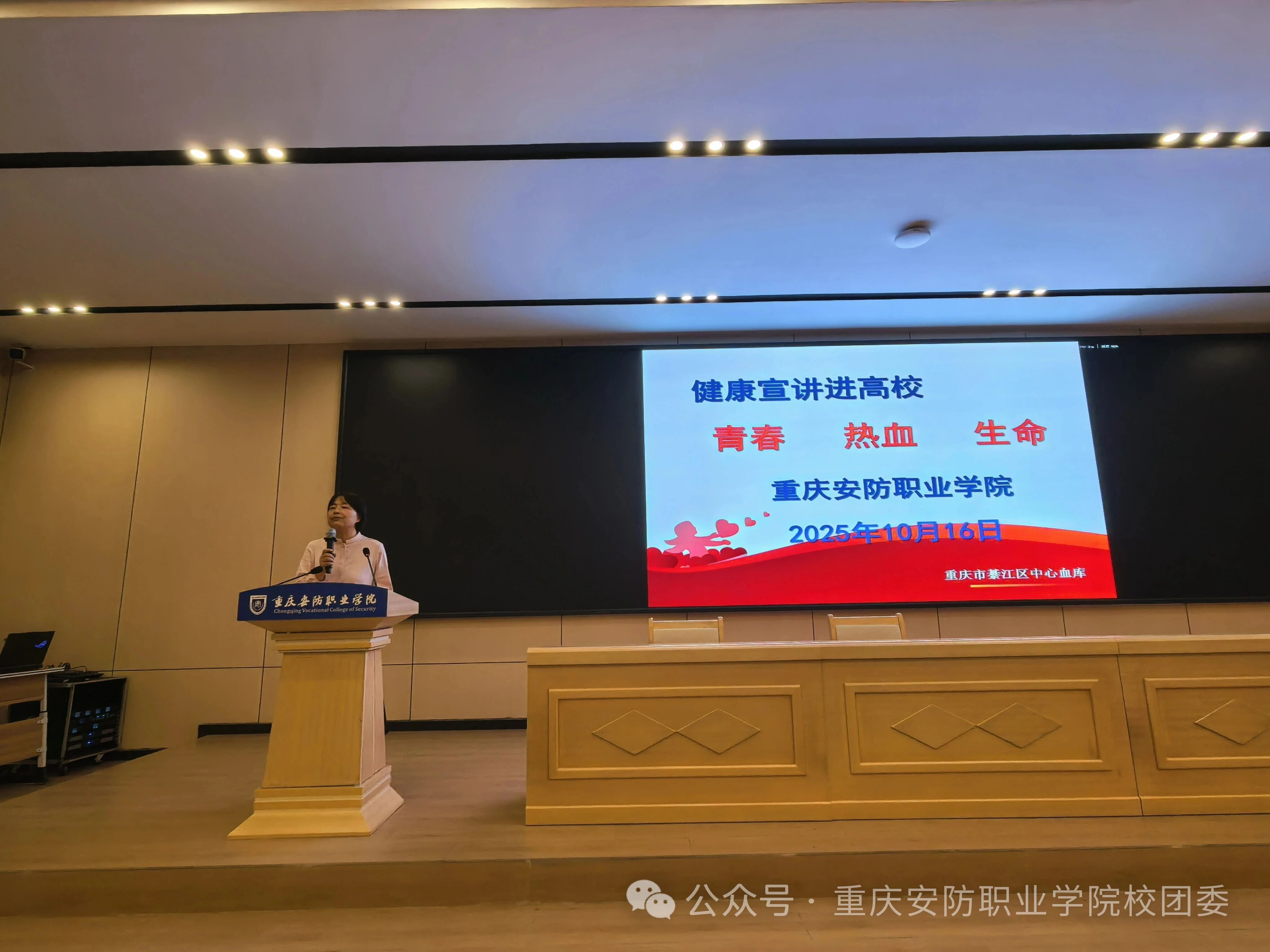 10 月 16 日,健康宣讲会在学校2号报告厅举行。綦江区红十字会、中心血库工作人员,围绕献血流程、注意事项、健康益处展开详细讲解,还特别加入安防应急救护知识分享环节—— 向师生科普心肺复苏的关键步骤、伤口快速止血包扎方法,以及日常突发失血情况的紧急处理技巧,让大家在了解献血知识的同时,掌握更具安防特色的实用急救技能,为 “以安防之力 护生命安全” 筑牢能力基础。
