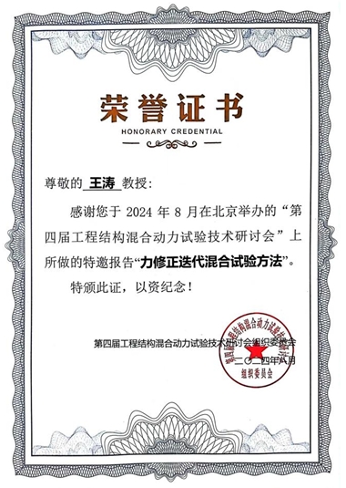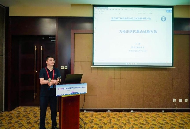 同时,我校王涛教授在研讨会上做了特邀作学术报告“力修正迭代混合试验方法”,交流了课题组在迭代方法、多任务加载方法和自适应模型力修正方法等混合试验领域关键问题的最新研究进展。
