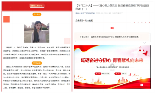 学院学工办、团委利用微信公众号推出专题讲座、学习视频等系列学习活动,让学生在校内、居家和返乡途中都能接收到学习信息,使学习实现全覆盖。学工办通过开展“青年先锋说”、线上演讲比赛等形式引领青年学子坚定理想信念,强化理论武装,学院团委通过开设“学贯二十大”学习专栏,以青春之声传递青春力量。