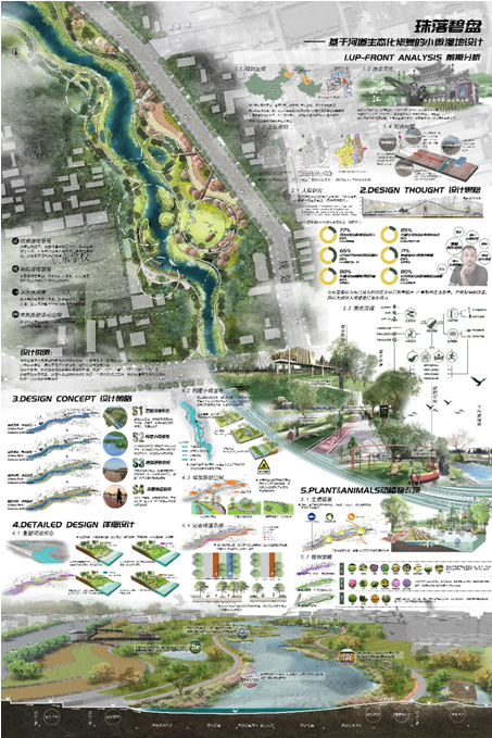 本科生组要求参赛者自选家乡或所在城市的一条城市河道进行设计,长度在500米左右,河滨绿地宽度自定,将其改造更新为城市中别具特色的河道景观带,在修复水陆生环境的同时,兼具文化价值及生态价值,同时注重市民的参与性和体验性。设计方案要求选择适宜的河道治理方案,通过植物、水体、驳岸的多样化组合方式,在对河道进行综合治理与修复的同时,创造出优美的景观环境,为游客提供休闲娱乐的空间,为城市塑造明亮的名片。设计地块与周边城市空间要做好衔接,植被、地形、水体、道路系统等可根据自己的设计进行调整;驳岸及护坡设计满足河道整治设计规范相关要求,满足输送、供水、防洪、赏景等功能。